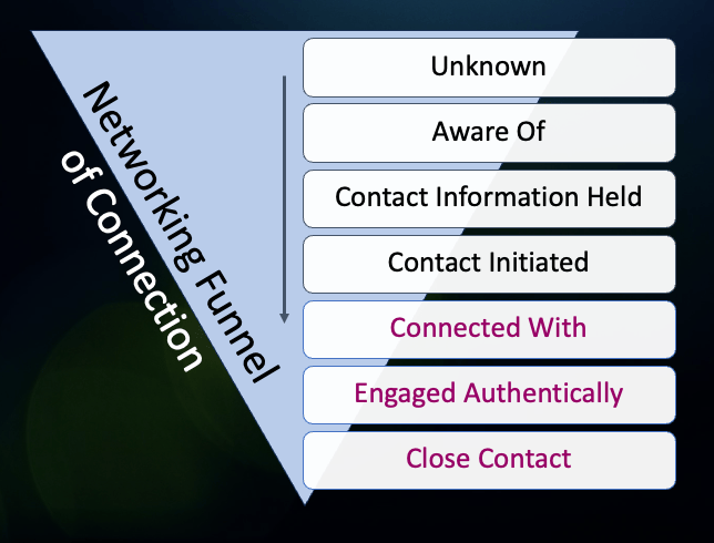 For those unfamiliar with the Networking Funnel of Connection, it’s a tool used to track your efforts to move an aspirational member of your network from “I gotta go find someone like this” (out of the vast ocean of 8 billion Unknown humans) all the way to “they’re in my Inner Circle.” (and all the significant effects these Close Contacts deliver).